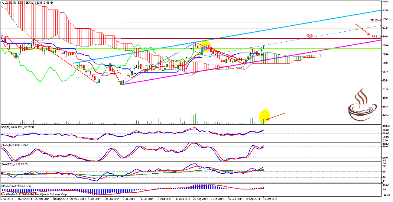 در چارت سهم ملاحظه می نمایید که سهم به خط میانه کانال دقیقا برخورد نموده است. در این حالت اندیکاتور ها هیچگونه سیگنال نزولی را صادر نکرده اند برعکس بار قبلی که با برخورد به خط میانی اندیکاتورها نزول را نشان می دادند. قیمت بالای ابر است ولی سایه قیمت (چیکواسپن) تازه به قیمت برخورد کرده است. خارج شدن آن از زیر قیمت خودش سیگنال صعود است!! بنابراین به احتمال خیلی زیاد این بار سهم موفق به شکست خط میانی کانال خواهد شد که با خروج چیکواسپن از زیر قیمت همراه است. که در این صورت اولین مقاومت سهم عدد 345 می باشد کهاز همپوشانی فیبو 61.8 و یک مقاومت از گذشته بدست آمده است. پس در این مرحله هدف 345 می باشد و در صورت شکست آن البته با چند روز نوسان روی آن، هدف سقف کانال خواهد بود.