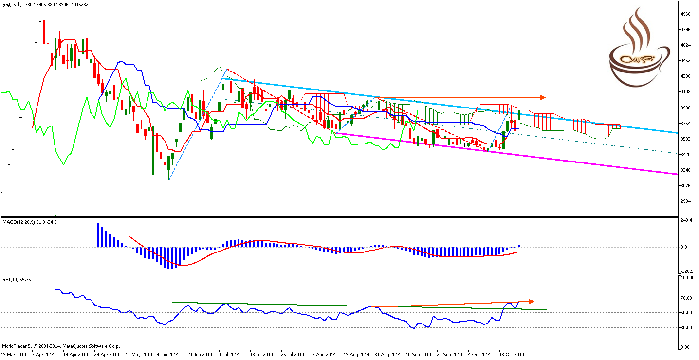 در تحلیل قبلی از سهم روند گفتیم که سهم در یک کانال نزولی در حال نوسان است. با گزارش خوبی که ارائه شد و با توجه به معاملات امروز سهم وضعیت بسیار مساعدی گرفته است به طوری که با حجم بسیار خوب و با یک کندل بسیار خوب به سقف کانال یورش برده است از طرفی از منظر سیستم ایچیموکو ابر کموی قرمز رنگ نازک شده و انتظار یک پیچش کمویی را به ما وعده می دهد. چیکو اسپن بسیار پر قدرت از زیر قیمت به بالا ی آن آمده و این خودش یک سیگنال پر قدرت صعود است. ورود اندیکاتور MACD به فاز مثبت نیز خودش تایید کننده روند صعودی سهم خواهد بود.