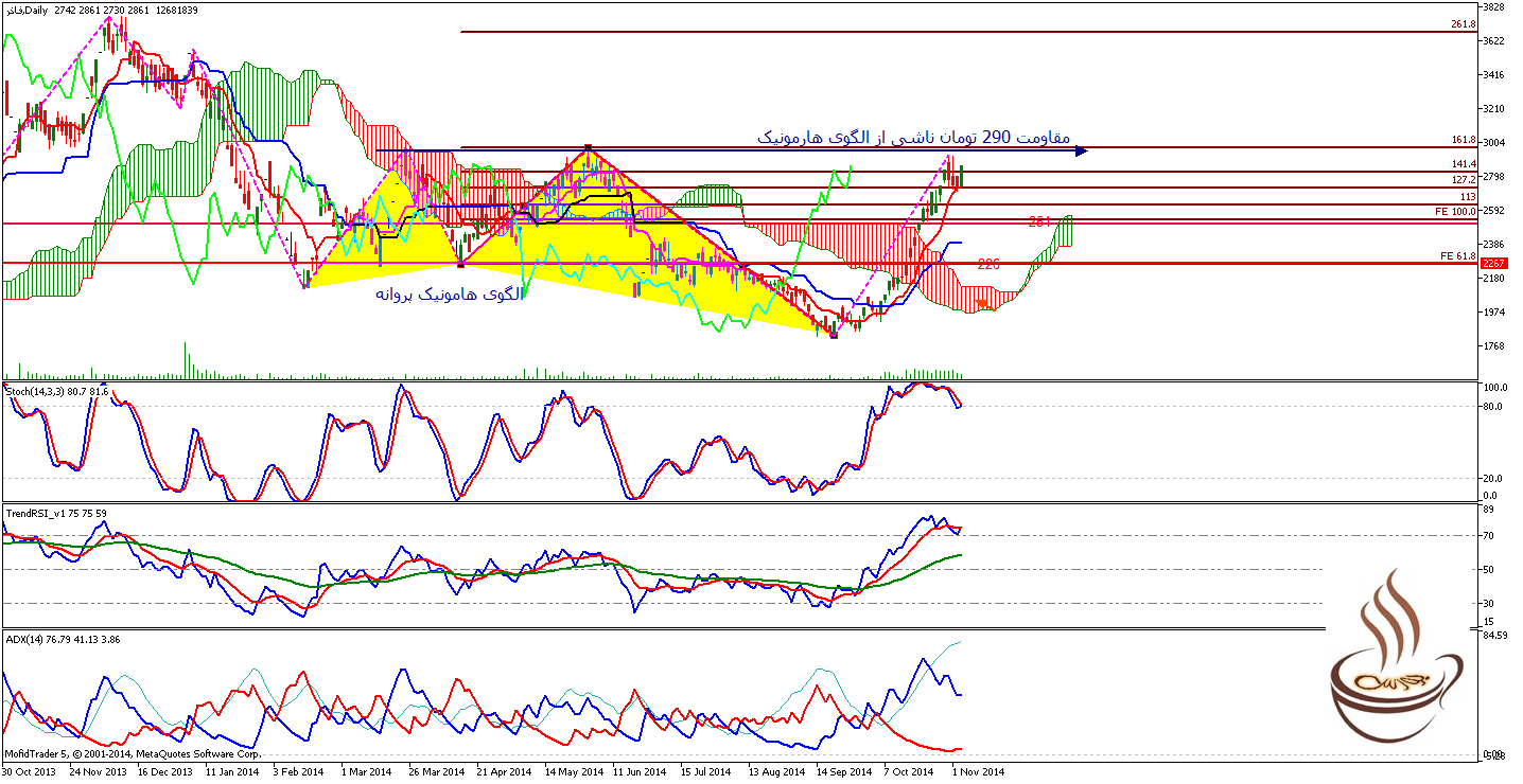از لحاظ تکنیکال گرچه بازهم اندیکاتورها سیگنال صعودی می دهند اما مقاومت مهم سهم 290 تومان می باشد که ناشی از الگوی هارمونیک گذشته و فیبوی 168 درصد است.